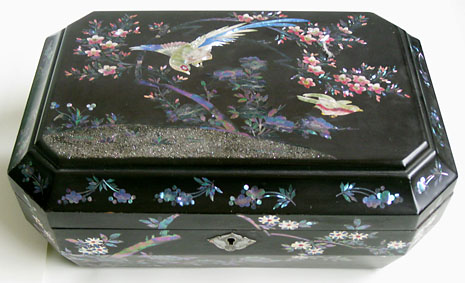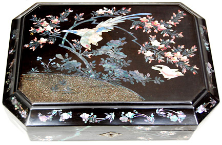 | After 1820 a more regular export started of Nagasaki lacquer boxes and furniture with mother of pearl inlay made after western models. You can see some fine examples in this and next pages. |