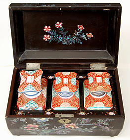 Nagasaki lacquer box with mother of pearl inlay. Inside three porcelain bottles